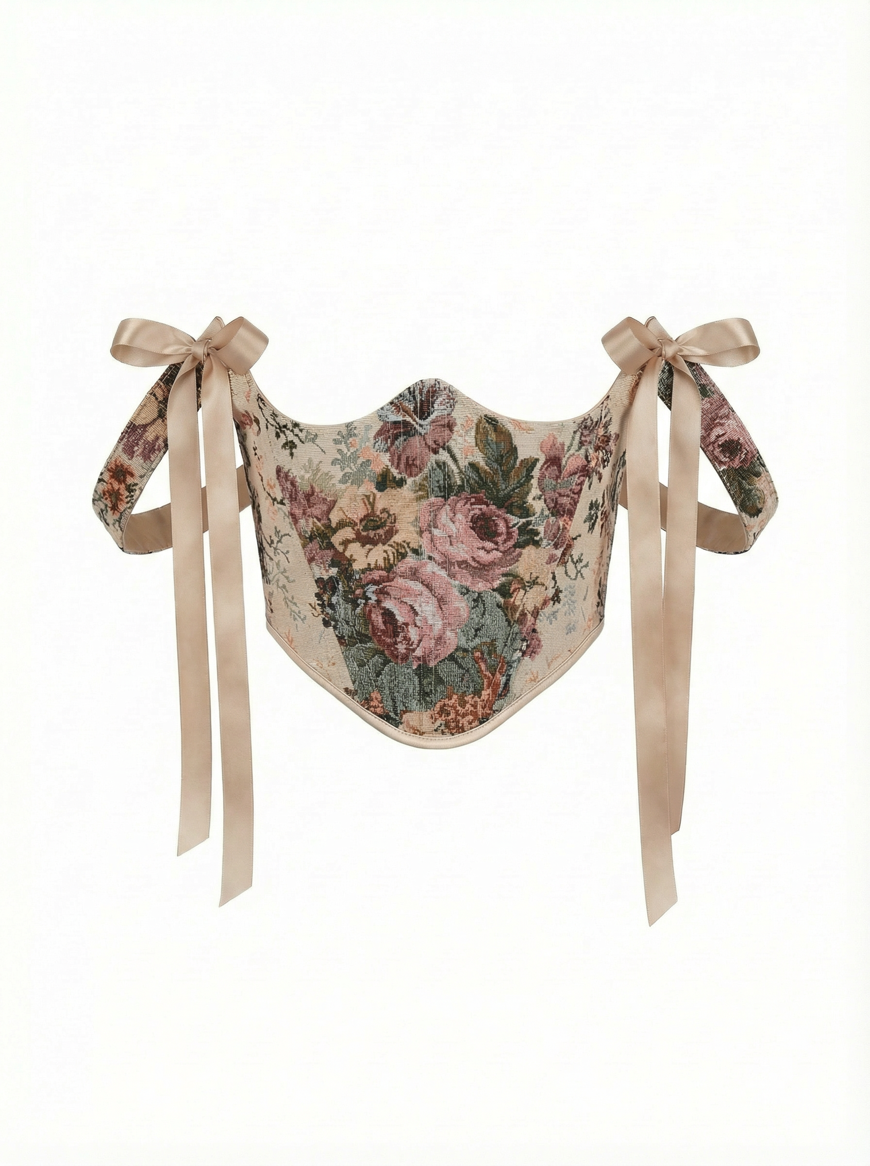 Crafted from delicate pink floral tapestry fabric, this corset blends Renaissance inspiration with modern tailoring. Unlike costume pieces, it is fully structured and handmade for durability and long-term wear.