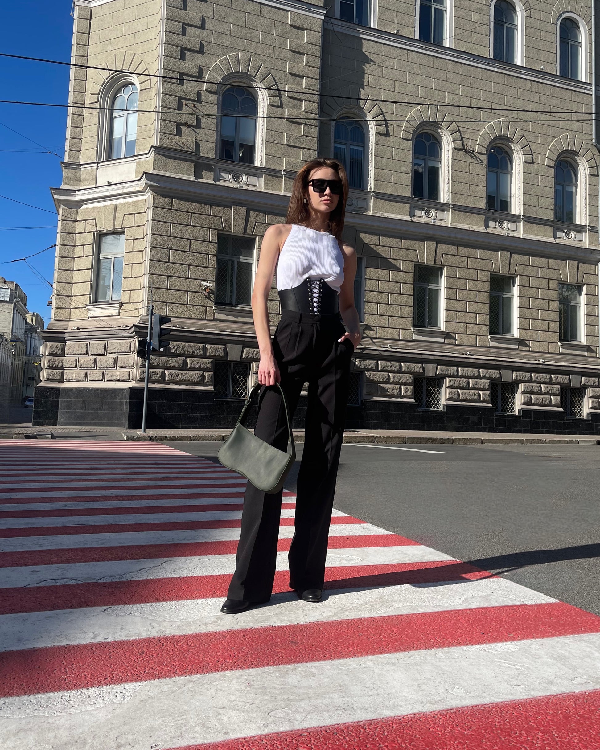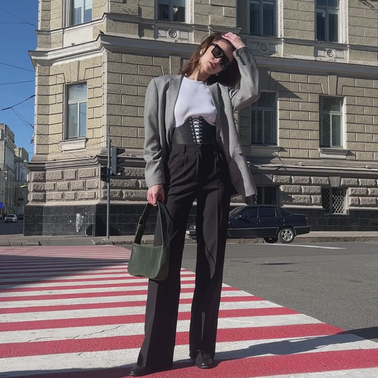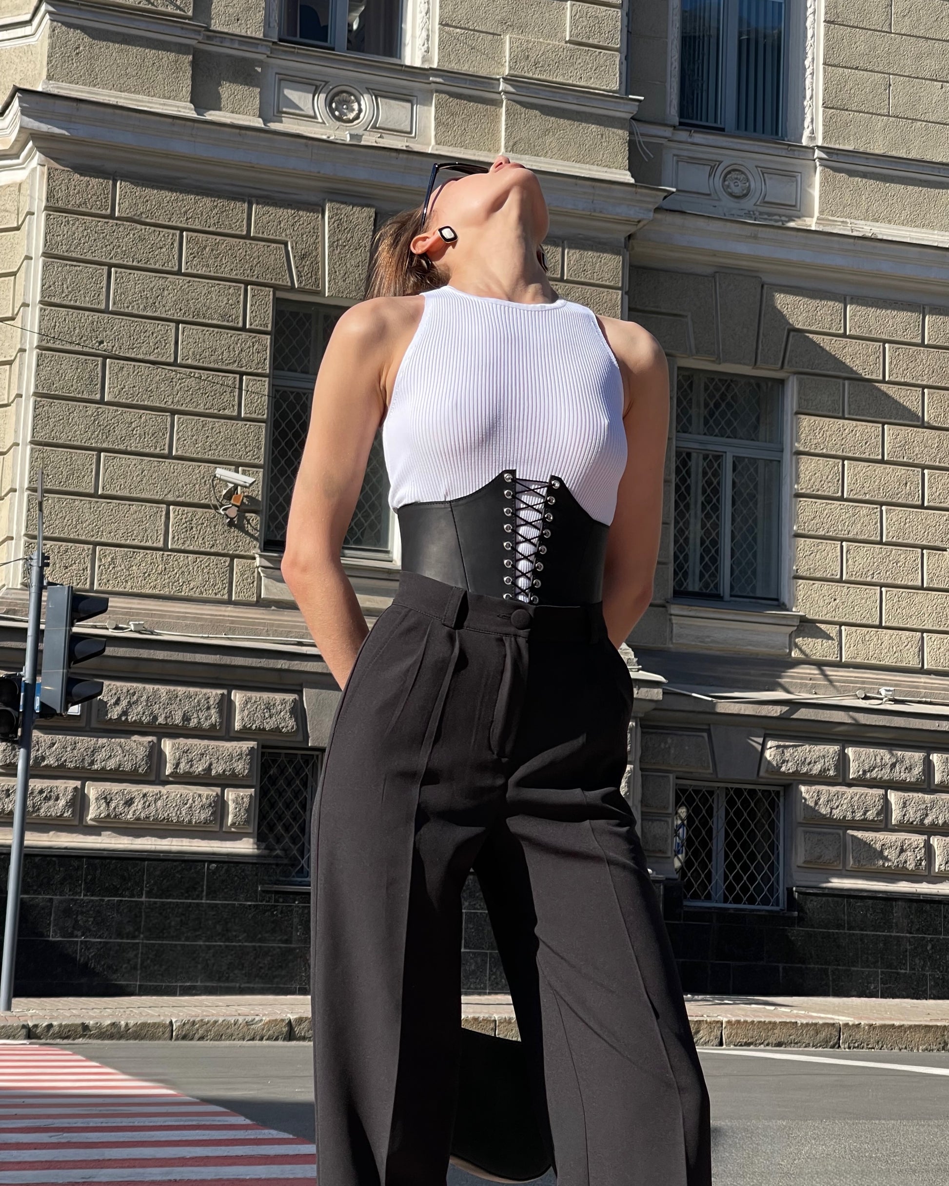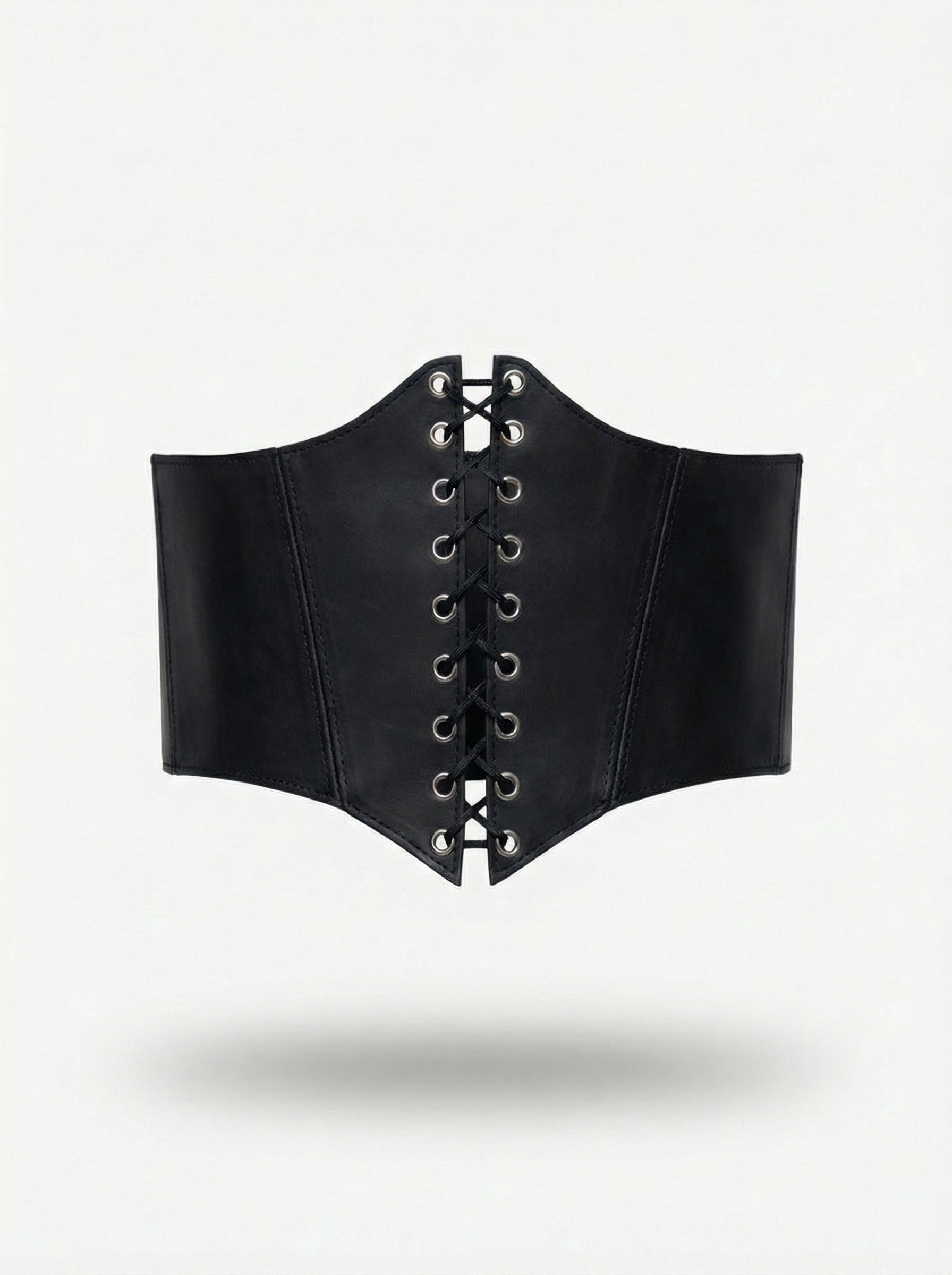 A structured leather corset belt designed to define the waist and elevate any silhouette with sculptural precision.