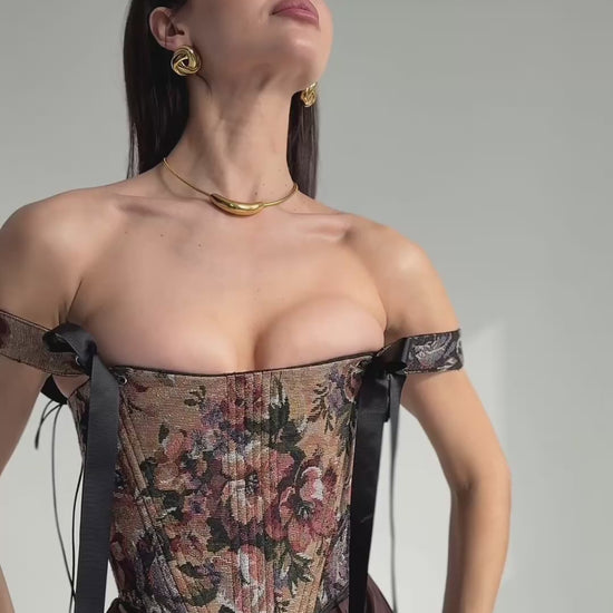 Reversible Renaissance Corset Top in Floral Jacquard with Brown Flowers