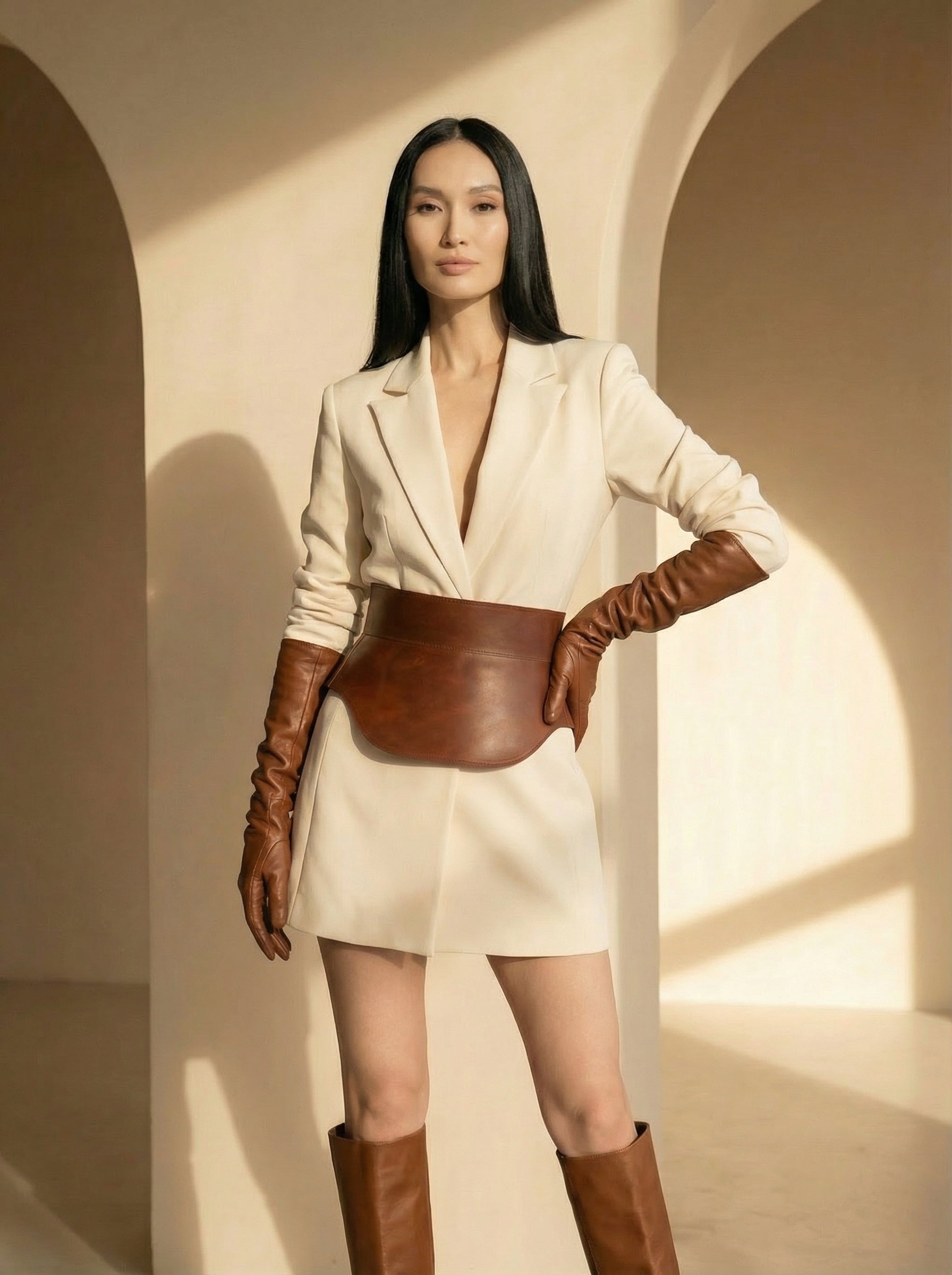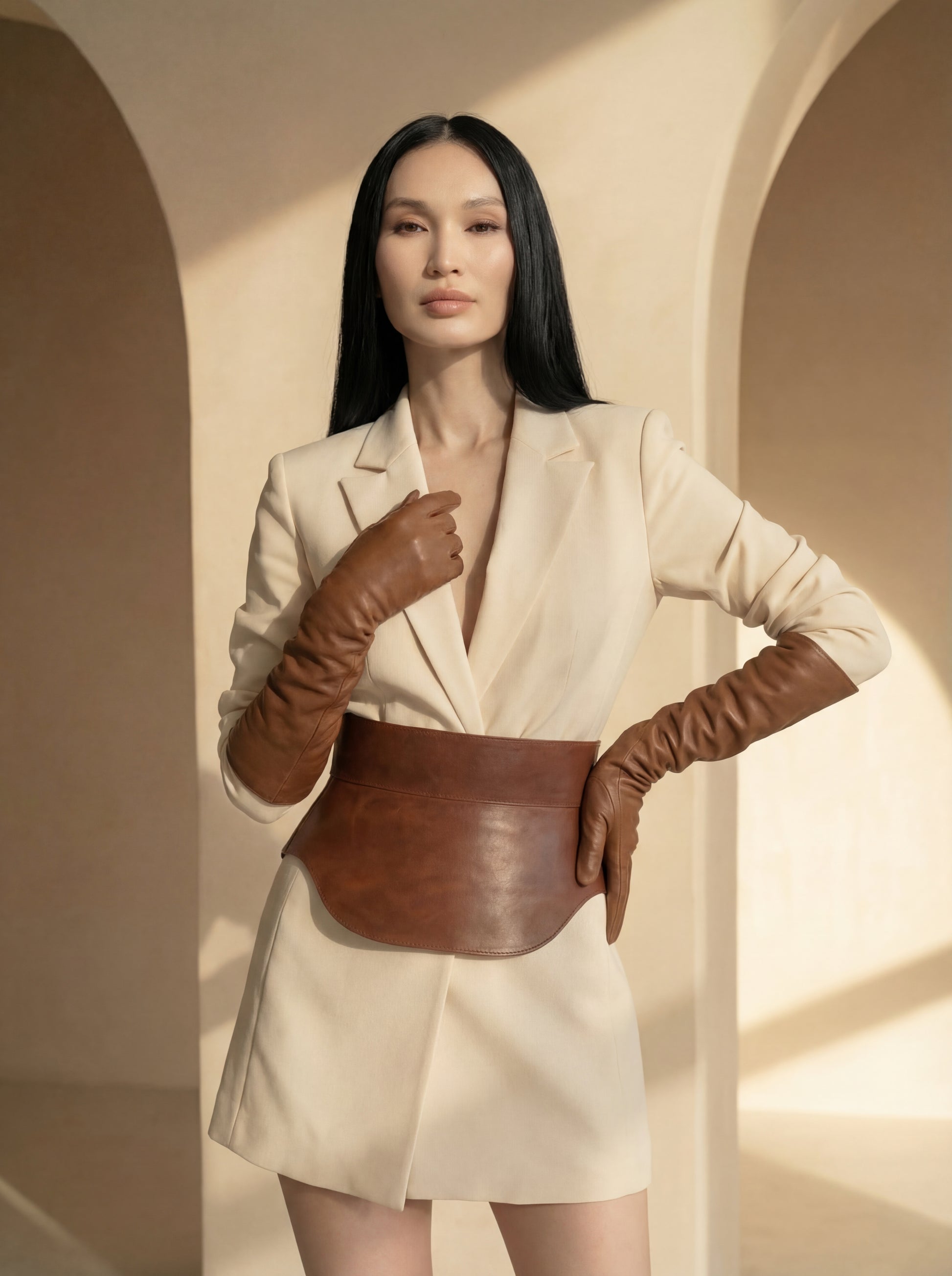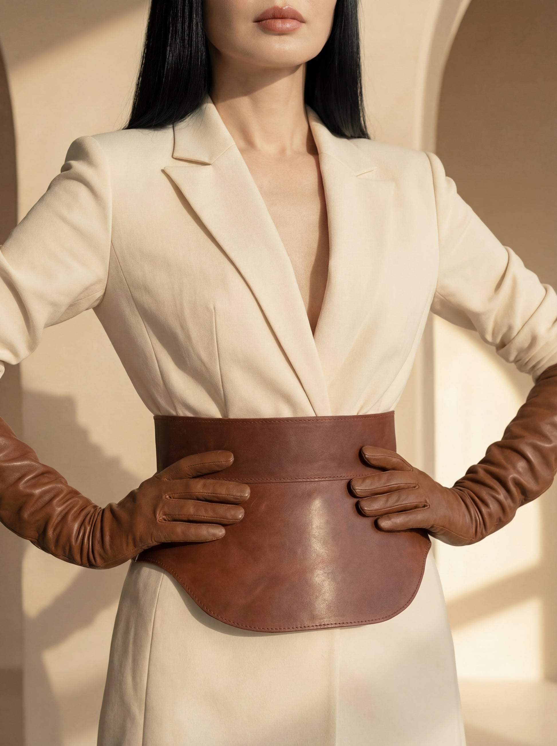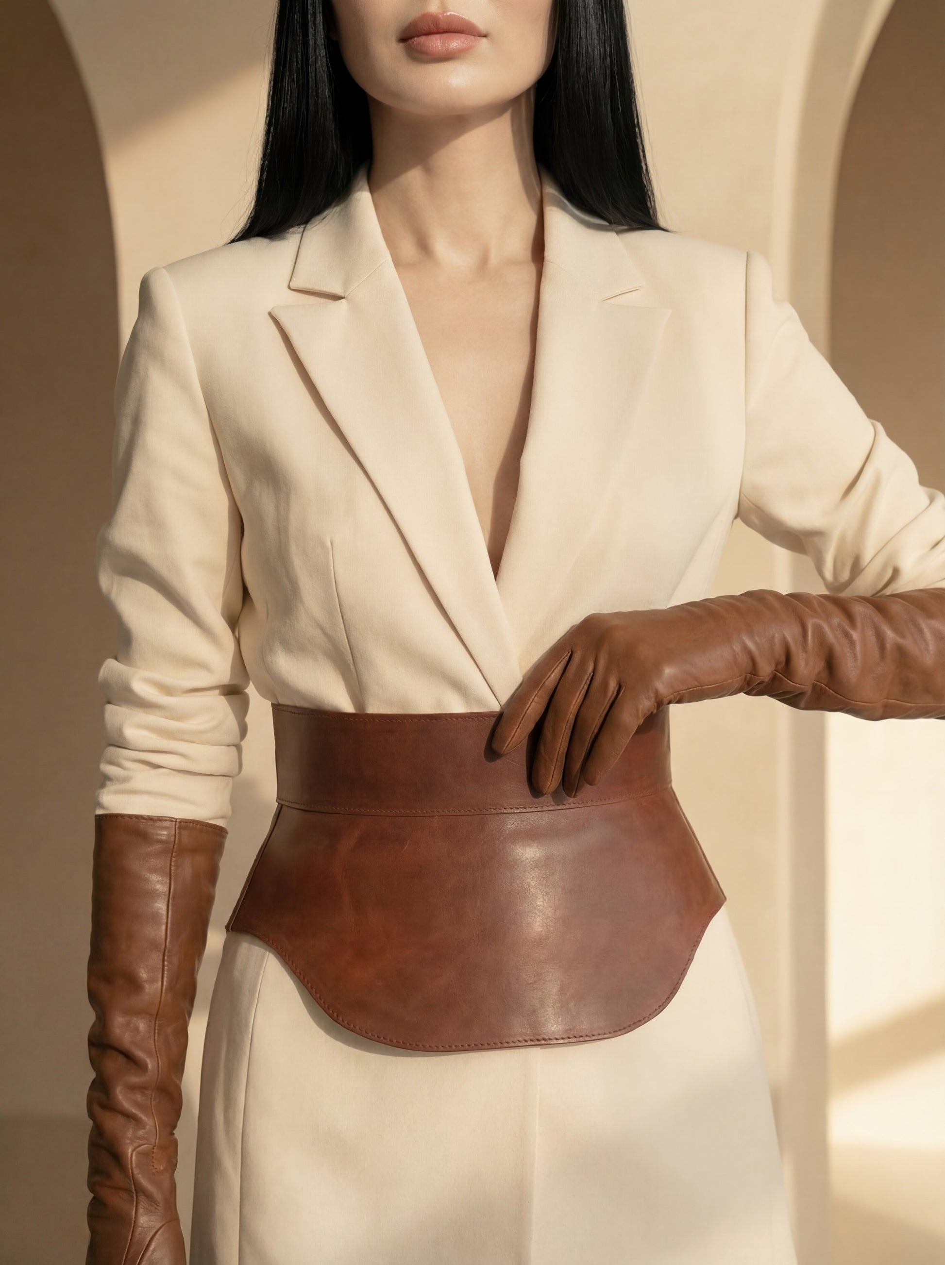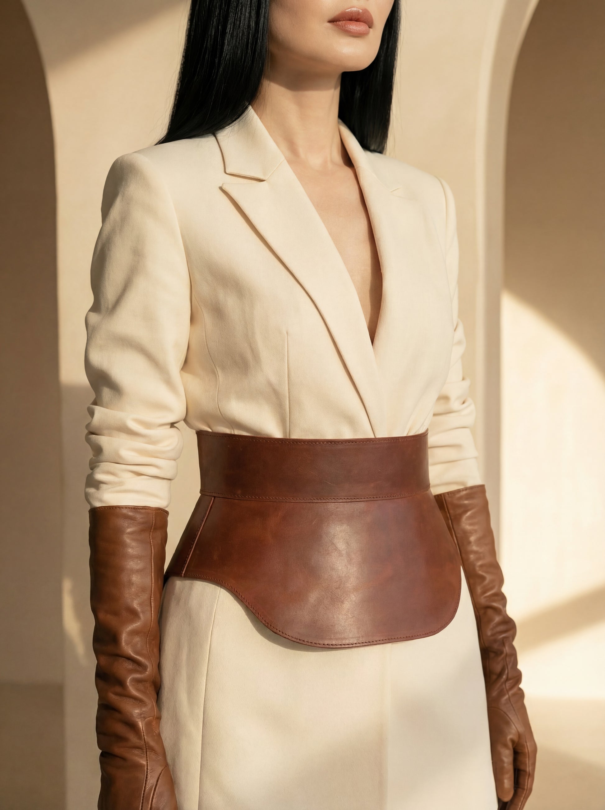 Виготовлений зі справжньої шкіри, цей пояс-корсет додає вашому образу м’якості та структурованості. Він слугує багатошаровим елементом, який перетворює простий одяг на стильний силует.